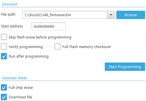 Select the boxes: “Run after programming”, “Full chip erase”, and “Download file”