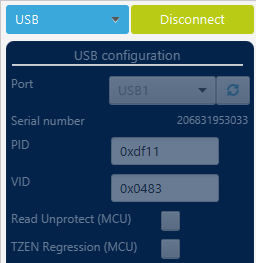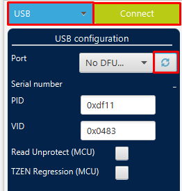 In STM32CubeProgrammer, select USB, refresh the devices, select the ECU, and connect.